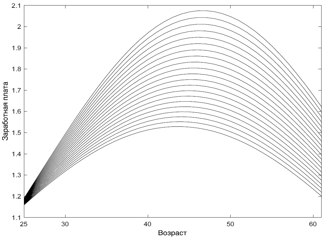 Доля людей в экономике, имеющих высшее образование, определяется на основе данных Росстата о структуре занятых по уровню образования и возрастным группам (табл. 3). В разных возрастных группах доля людей, имеющих высшее образование, неодинакова. Для старших поколений она существенно ниже, чем для современных молодых когорт. Мы будем рассматривать долю людей с высшим образованием в возрасте 25–29 лет, поскольку большинство людей в этой возрастной группе, если планировали получать высшее образование, то уже закончили учиться. Кроме того, они принимали решение о получении высшего образования не так давно, как другие возрастные группы, т.е. ориентировались на современную экономическую ситуацию. Для возрастной группы 25–29 лет эта доля равна 41,1%. Такой будет предполагаться доля людей с высшим образованием в рабочей силе в исходном долгосрочном равновесии в нашей модели.