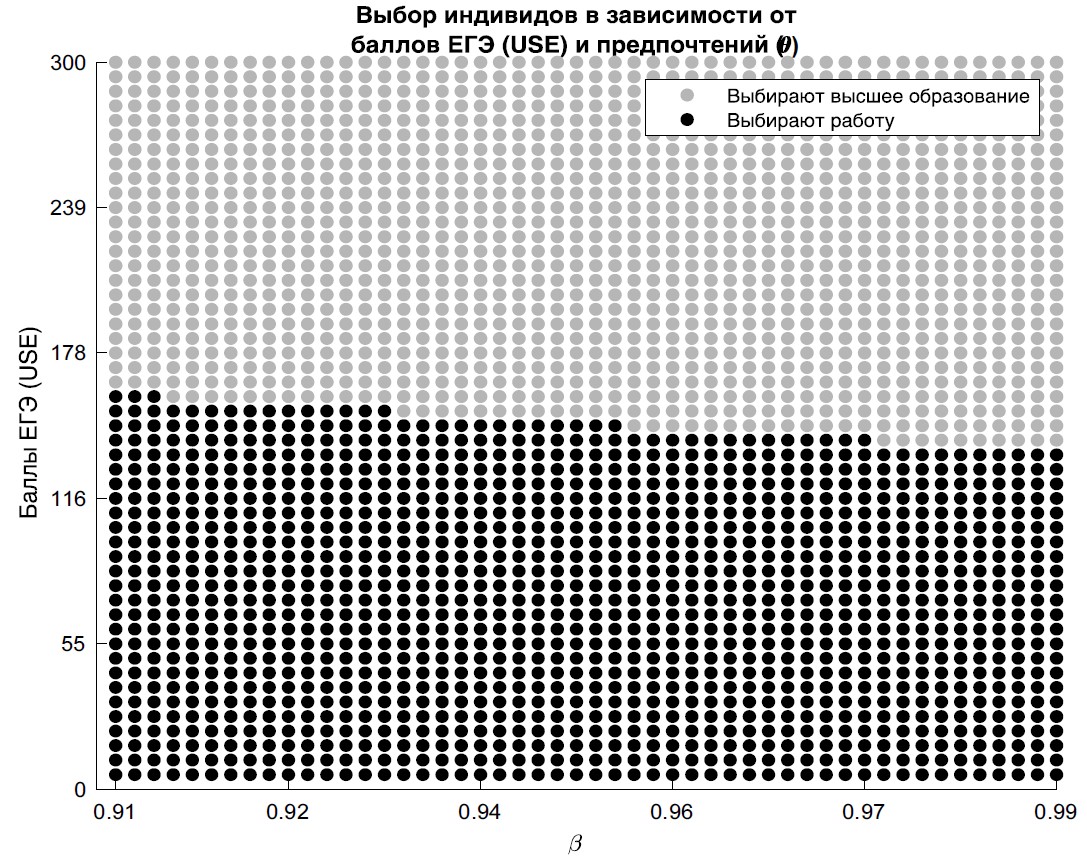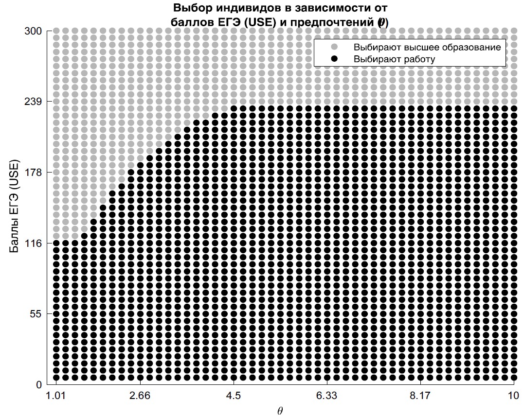 В соответствии со статистикой Минобрнауки, мы будем предполагать, что в экономике 47,8% студентов учится за счет бюджетных средств по программам бакалавриата. На основе этого значения определено значение – величина баллов ЕГЭ, начиная с которых обучение индивида происходит за счет государства. Она подбирается таким образом, чтобы 47,8% индивидов в стационарном состоянии учились на бюджетных местах.