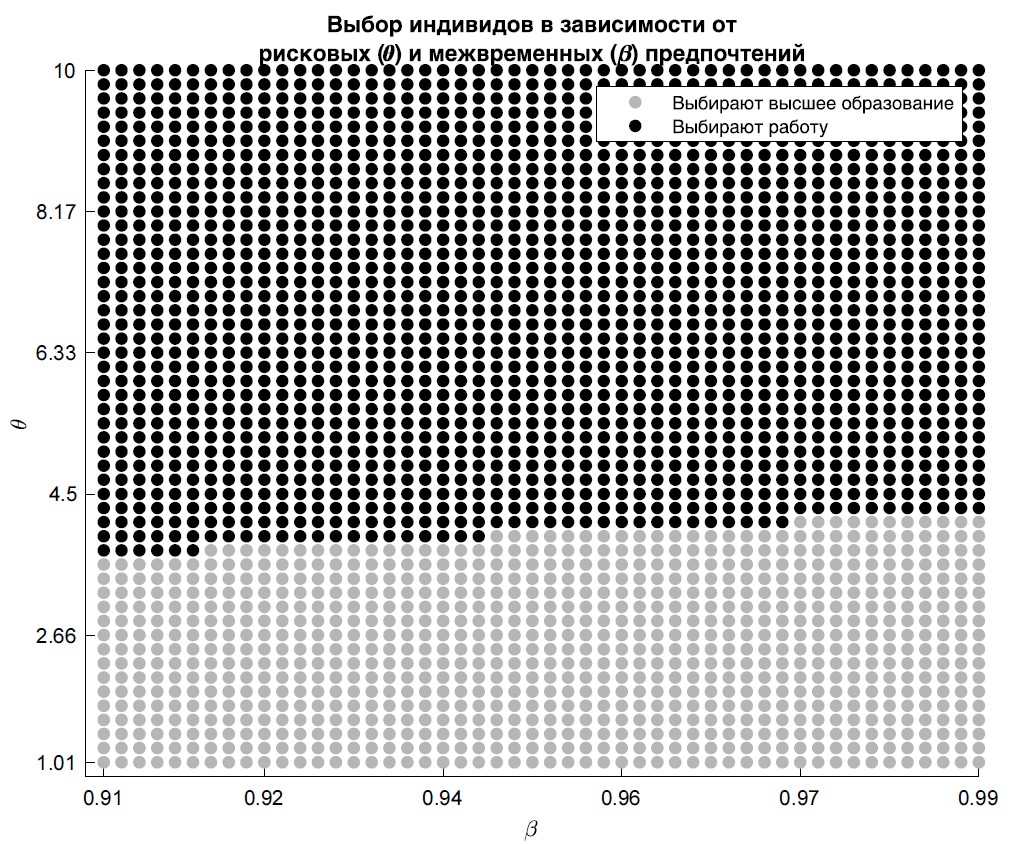 Ключевыми предпосылками модели, отличающими ее от ряда других, являются гетерогенность индивидов по параметру несклонности к риску, коэффициенту дисконтирования и набираемым баллам ЕГЭ. Необходимость учета гетерогенности индивидов в отношении параметра несклонности к риску связана с тем, что образование – это благо, приобретение и использование которого сопряжено с рисками. Колебания доходов в течение жизненного цикла, возникающие в результате случайных факторов, порождают для индивида колебания потребления, которые он стремится минимизировать. И чем больше степень неприятия риска, тем больше он предпочитает пусть меньшее, но детерминированное потребление, большему ожидаемому, но недетерминированному потреблению. В случае, если индивиды являются несклонными к риску, неопределенность в будущих доходах и расходах может сдерживать инвестиции в человеческий капитал, если накопление человеческого капитала ведет к росту вариации дохода.