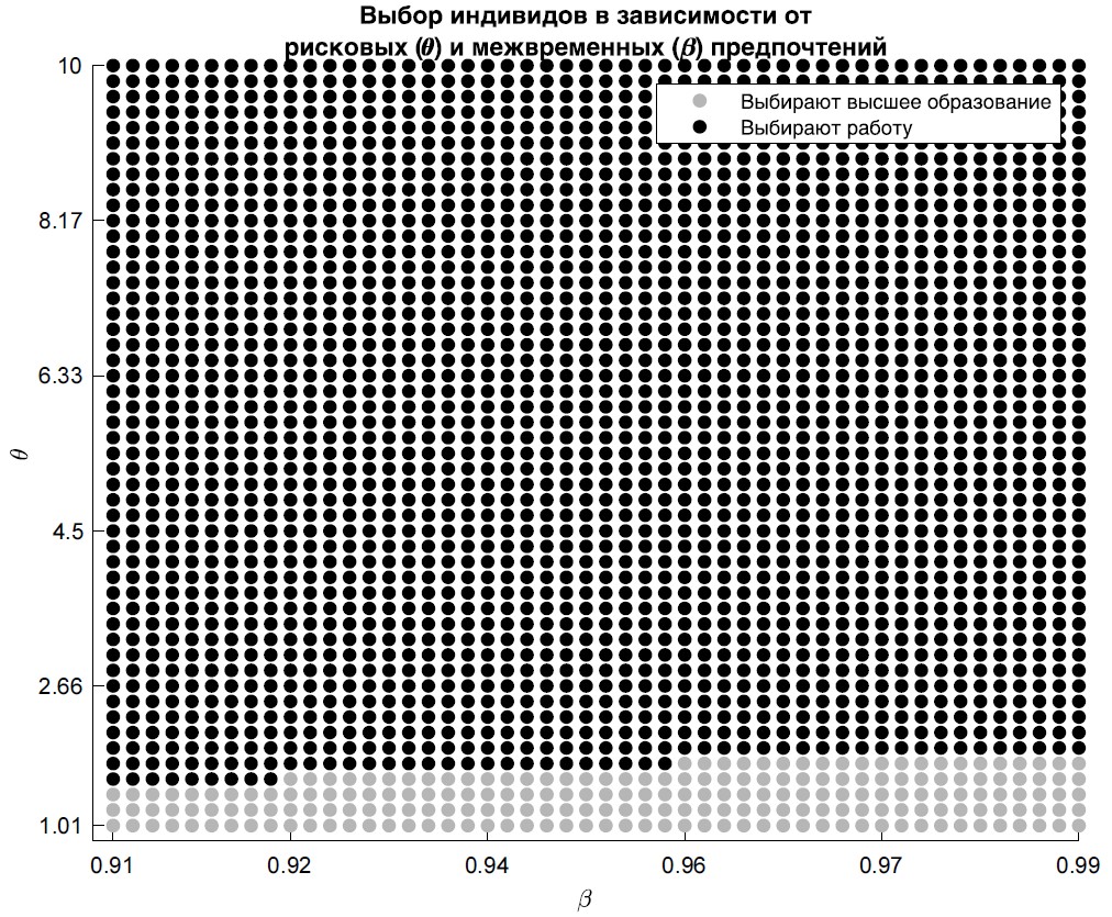 Получение образования предполагает получение долгосрочных и отложенных во времени выгод, что обусловливает необходимость учета гетерогенности индивидуальных коэффициентов дисконтирования. Более смещенные к настоящему индивиды, т.е. те, кто больше ценит текущее потребление, чем потребление в будущем, могут быть не заинтересованы в получении высшего образования, расходы на получение которого они понесут сегодня.