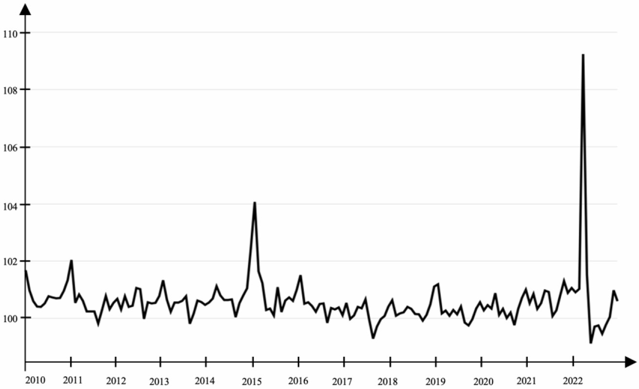 На рис. 2 представлена помесячная инфляция в Пермском крае с января 2010 г. по декабрь 2022 г. Заметим, что несколько месяцев характеризуются резким ростом инфляции. Данный паттерн характерен и для всех остальных 13 исследуемых регионов ПФО. Инфляция в Пермском крае – нестационарный процесс, что подтвердил расширенный тест Дики – Фуллера.
