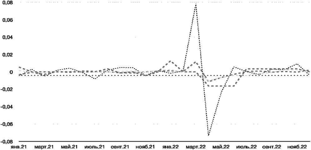 В расчетах инфляция приведена к стационарному процессу через натуральный логарифм и первую разность в логарифмах для всех регионов в выборке. Анализ рис. 2 показал, что в марте 2022 г. наблюдается всплеск инфляции, который остается заметным даже после приведения ряда к стационарности, хотя в остальные периоды помесячная инфляция изменяется близко к нулю. Модель AR(1) строит прогноз, схожий с наивным прогнозом, при котором значения инфляции в прогнозных периодах соответствуют значению последнего известного периода, за исключением первых трех месяцев. Модель ARIMAX с включением курса доллара, как внешнего фактора, стремится предсказать значения инфляции менее прямолинейно, повторяя форму реальной инфляции. Аналогичные результаты получены для всех регионов. Инфляция в каждом из регионов является интегрированным процессом первого порядка, и спецификация модели ARIMAX отличается от региона к региону (табл. 1). Тем не менее можно выделить наиболее часто встречающуюся модификацию модели – ARIMAX (1, 1, 1).