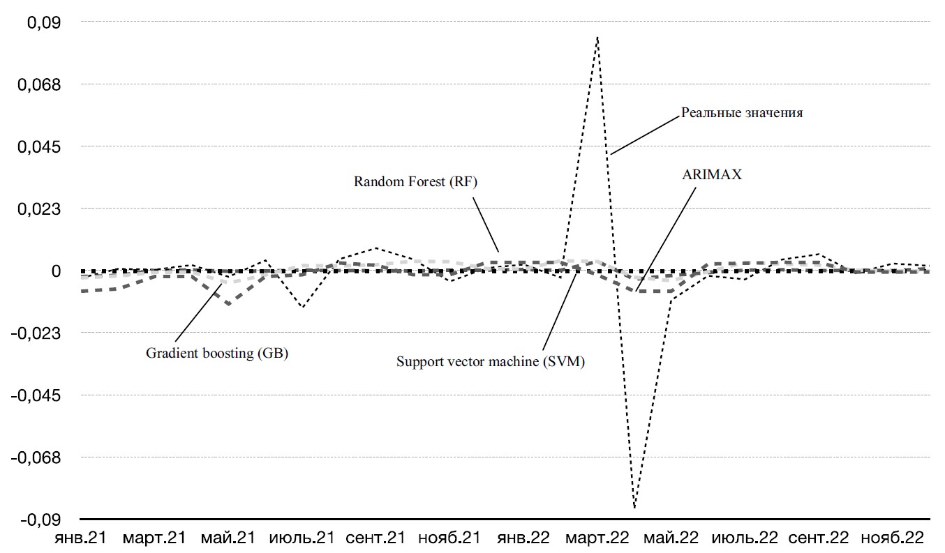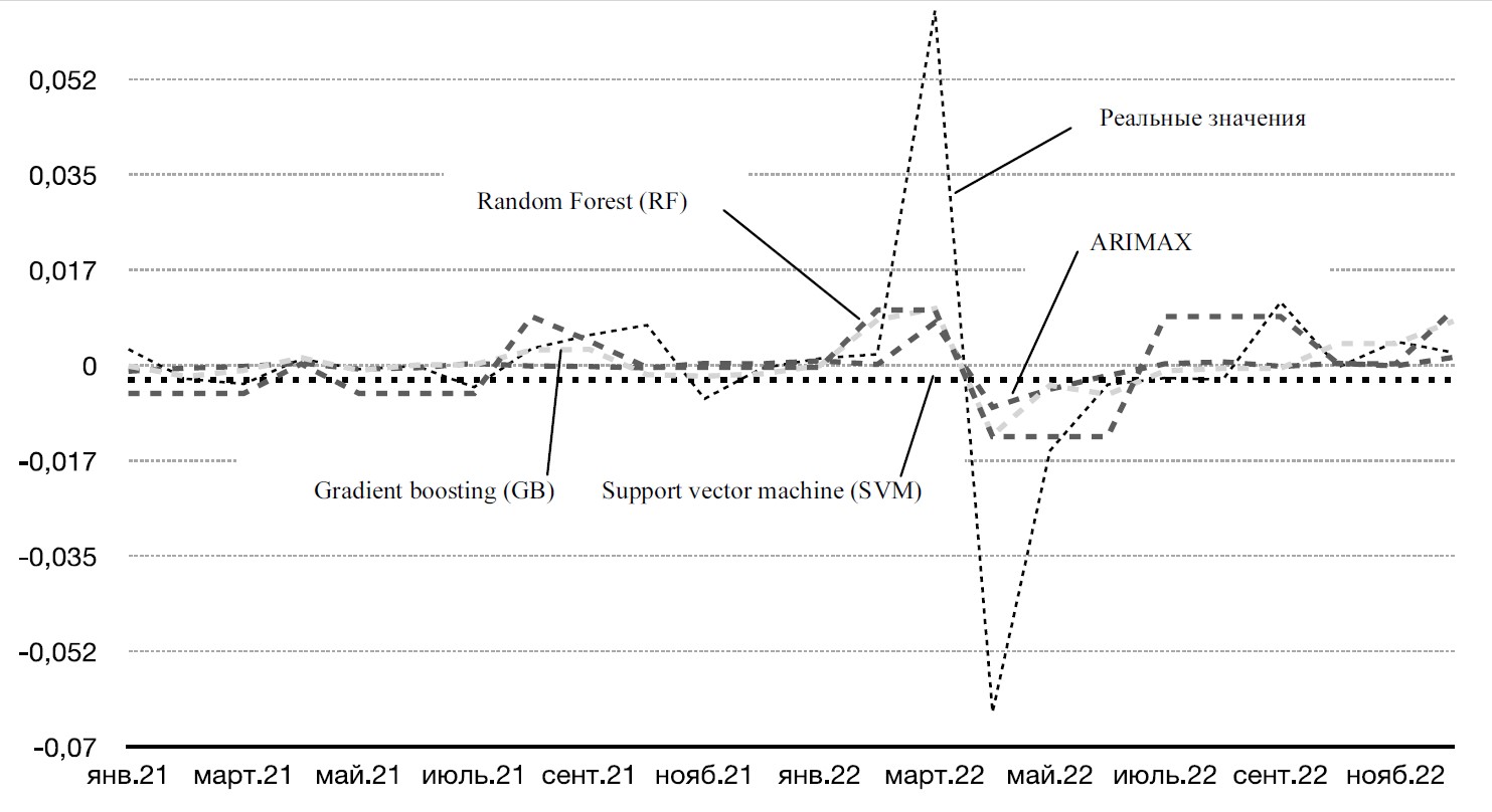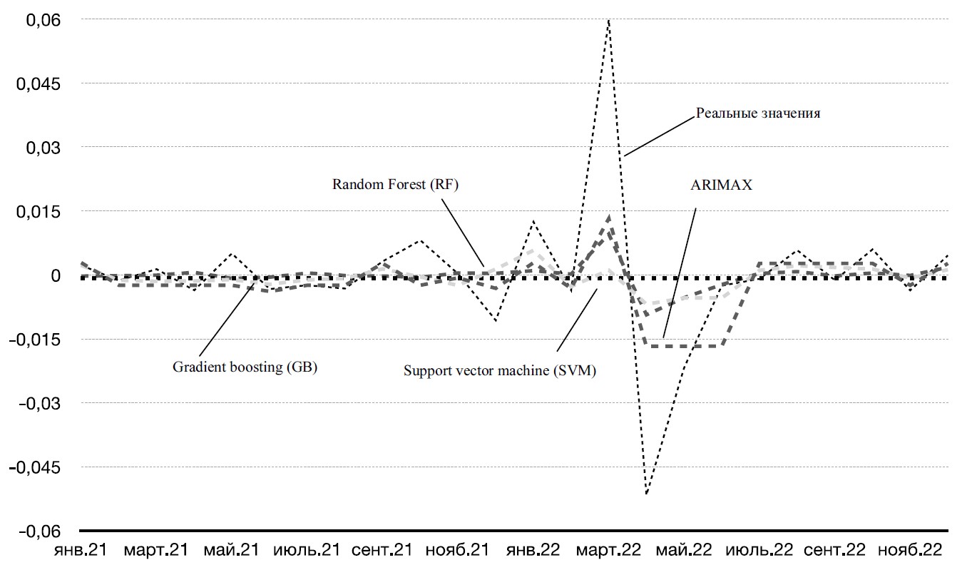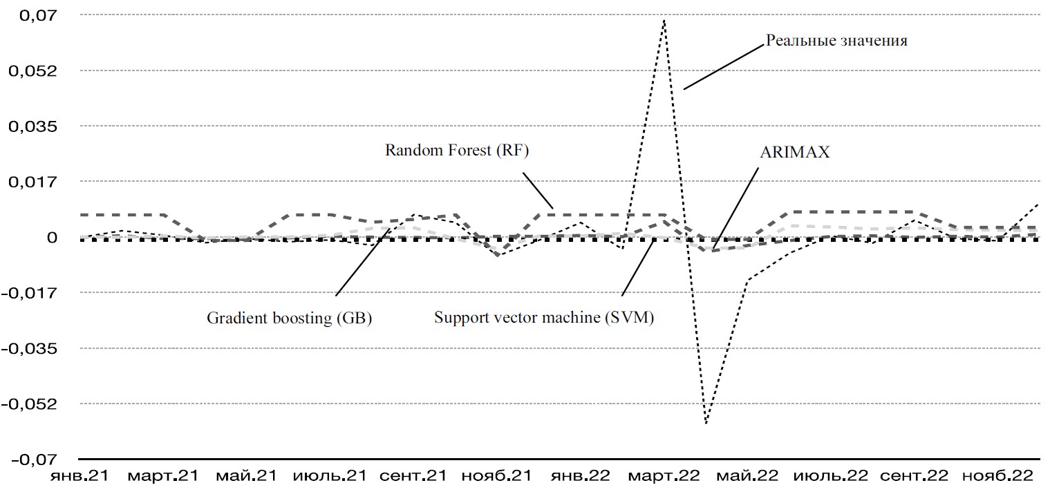 На рис. 3 представлен прогноз инфляции для Пермского края, рассчитанный на 24 месяца из декабря 2020 г. несколькими моделями машинного обучения (далее в статье такие визуализированные прогнозы представлены для всех регионов ПФО). Модели случайного леса и градиентного бустинга, аналогично модели ARIMAX, способны прогнозировать значительные изменения инфляции, однако не могут в точности определить реальный масштаб изменений показателя[3].
