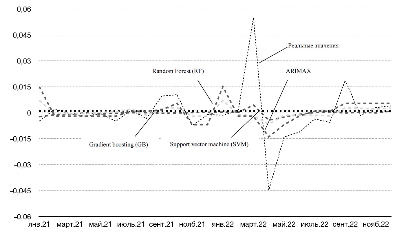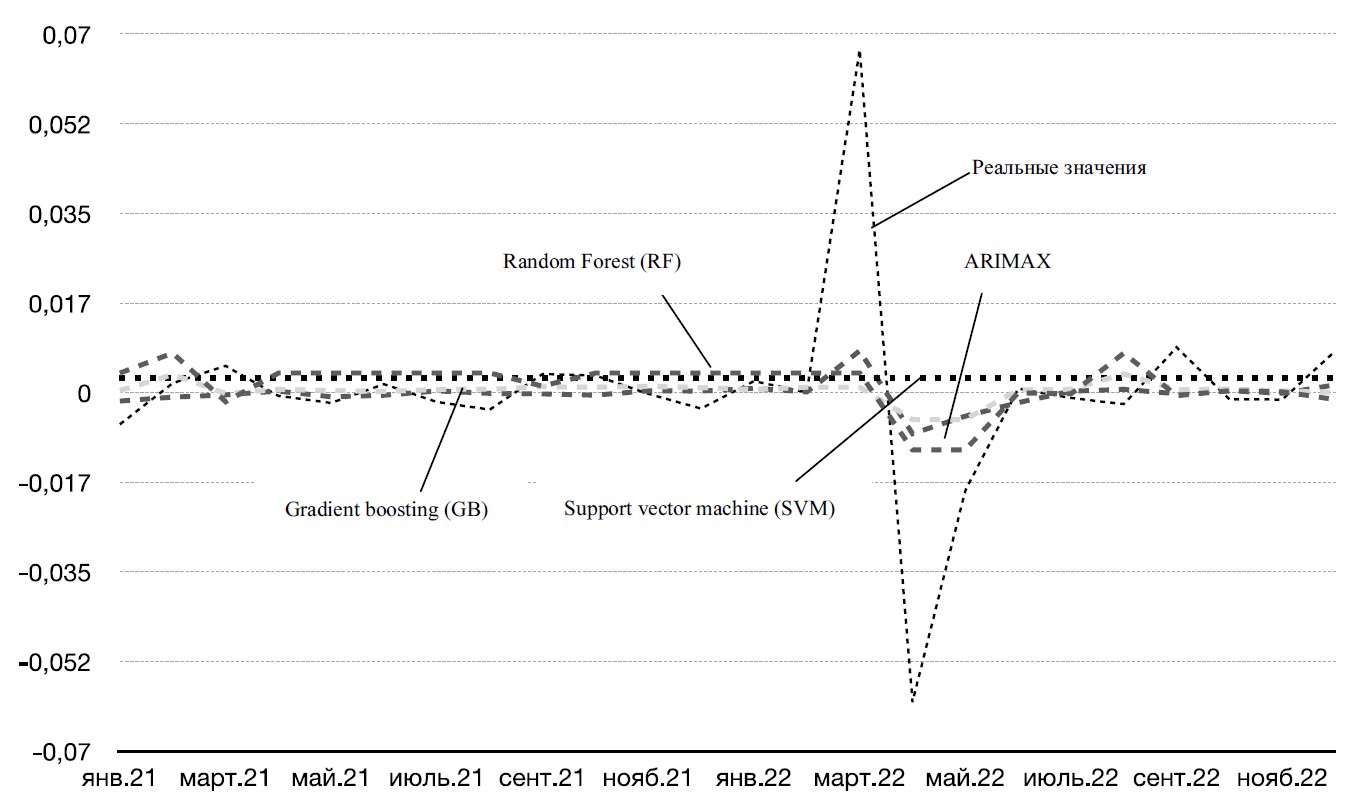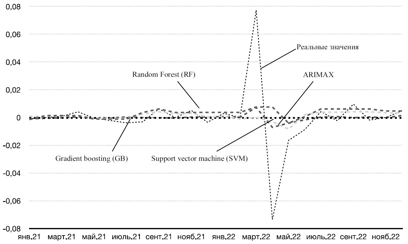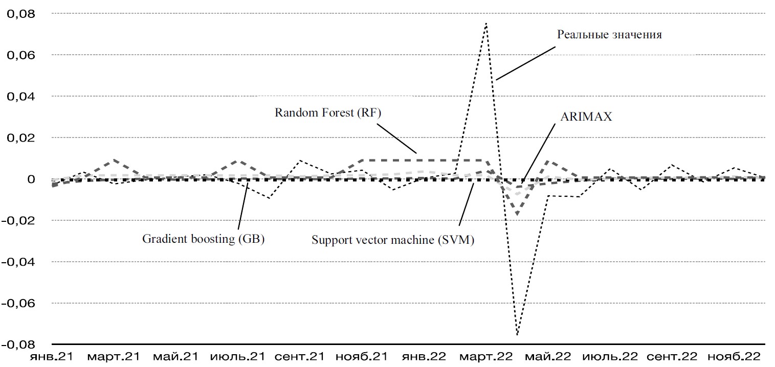 На рис. 3 представлен прогноз инфляции для Пермского края, рассчитанный на 24 месяца из декабря 2020 г. несколькими моделями машинного обучения (далее в статье такие визуализированные прогнозы представлены для всех регионов ПФО). Модели случайного леса и градиентного бустинга, аналогично модели ARIMAX, способны прогнозировать значительные изменения инфляции, однако не могут в точности определить реальный масштаб изменений показателя[3].