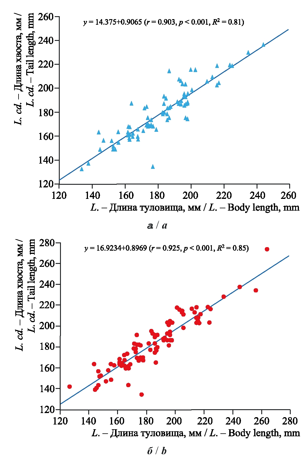 Уравнение регрессии, аппроксимирующее линейную зависимость длины хвоста от длины тела без хвоста, имело вид для самцов: L. cd. = 14.3755+0.9065L. (r = 0.903, p < 0.001, R2 = 0.81); для самок: L. cd. = 16.9234+0.8969L. (r = 0.925, p < 0.001, R2 = 0.85) (рис. 1).