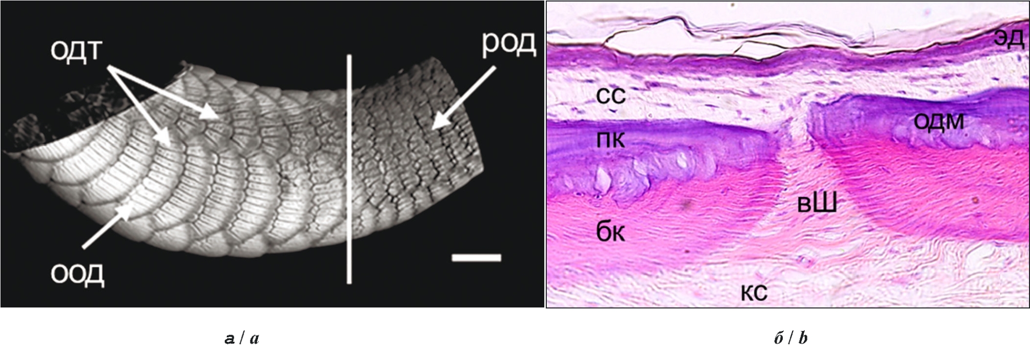 Fig. 1. Structure of the osteoderms of the tail section of E. taeniolata: a – reconstruction of the osteodermal cover of the tail with regenerate, made by computed microtomography (scale 2.5 mm); b – histological section of the original tail skin, stained with hematoxylin and eosin (50 μm). Denotations: бк – basal cortex, вШ – Sharpey's fibers, кс – compact layer of dermis, одм –osteodermin, одт – osteodermites, оод – original osteoderms, пк – superficial cortex, род – regenerating osteoderms, сс – papillary layer of dermis, эд – epidermis