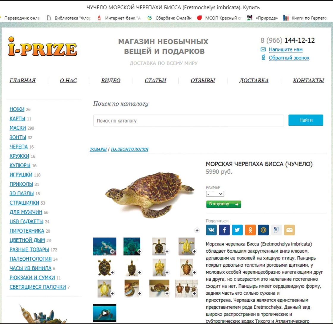 Рис. 1. Скриншот страницы сайта компании I-PRIZE (Магазин необычных вещей и подарков) с предложением о продаже: «Чучело морской черепахи бисса Eretmochelys imbricatа. Цена 5990 руб.»