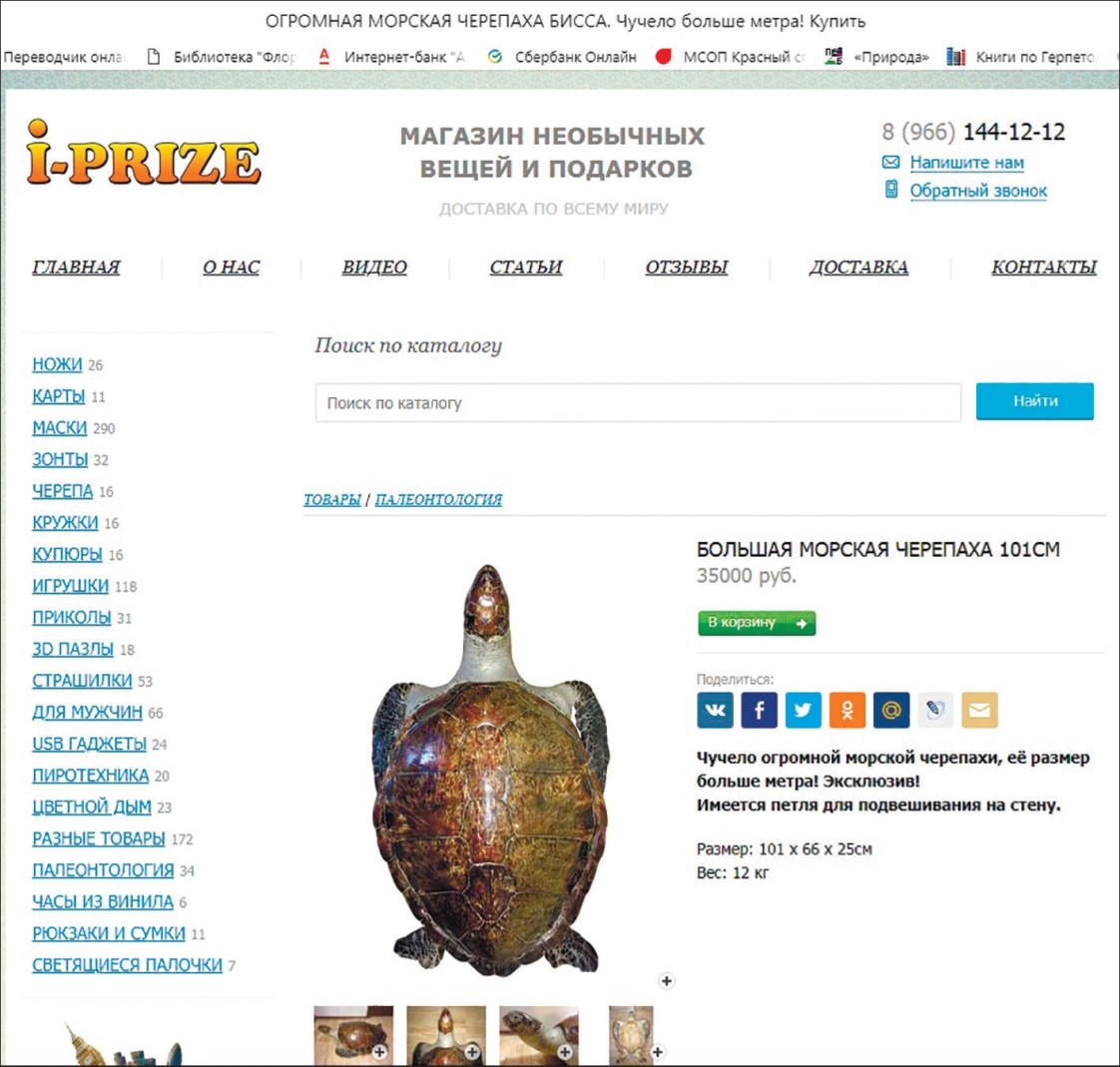 Рис. 2. Скриншот страницы сайта компании I-PRIZE (Магазин необычных вещей и подарков) с предложением о продаже: «Огромная морская черепаха бисса. Чучело больше метра! Цена 35000 руб.»