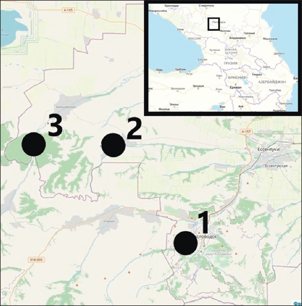 Рис. 2. Находки Bufo verrucosissimus в Каспийском бассейне в Российской Федерации: 1 – ущелье р. Аликоновка (город-курорт Кисловодск, Ставропольский край) (https://www.inaturalist.org/observations/163330332); 2 – станица Боргустанская (Предгорный район, Ставропольский край) (Лотиев, 2020); 3 – долина р. Кума между устьями рек Угольная и Кладбищенская Балка (наши данные)