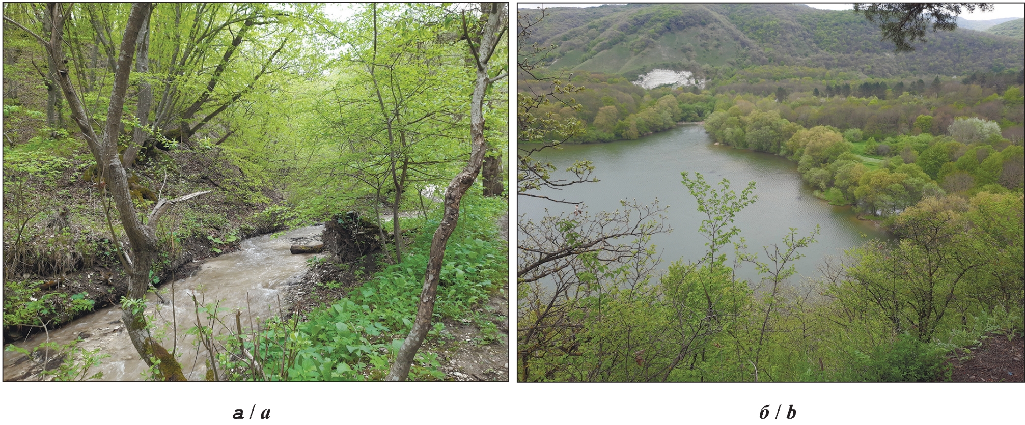 Рис. 3. Места находок Bufo verrucosissimus в ущелье р. Угольная (а) и на озере Бекешевское (б). Предгорный район, Ставропольский край, Российская Федерация, 7 мая 2023 г.