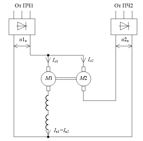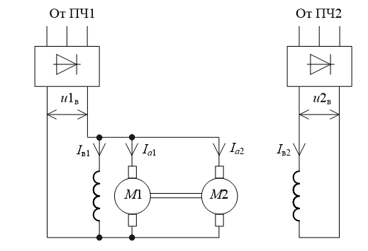 Система уравнений, описывающая работу МПТ в данной схеме, по сравнению с системой (3) будет изменена в части определения тока возбуждения обеих машин и примет следующий вид: