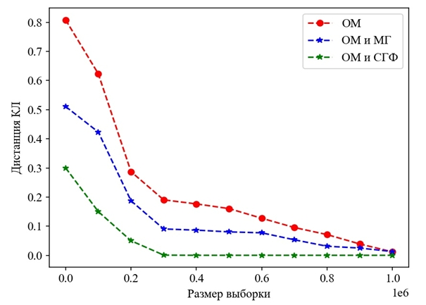 Рисунок – Значение дистанции Кульбака – Лейблера для алгоритмов ОМ, ОМ и МГ, ОМ и СГФ в зависимости от размера выборки D
