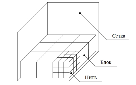 На рисунке 2 показана структура потоков на ГП. Самая маленькая единица в архитектуре CUDA – это поток или нить. Нити объединяются в блоки. Блоки в свою очередь объединяются в сетку.