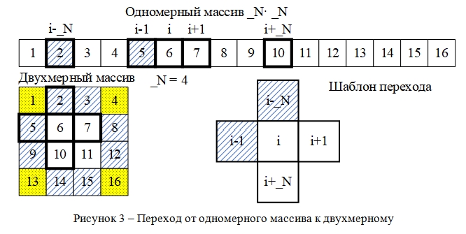 В центре пластины используется функция пятиточечного шаблона SH5(), которая приведена в листинге 2. Переход от одномерного массива к квадратному двухмерному представим графически (рис. 3). В данном случае для массива 4 на 4 остаются четыре центральные точки, для которых применяется пятиточечный шаблон. На рисунке 3 приведен шаблон для первой центральной точки с индексом 6.