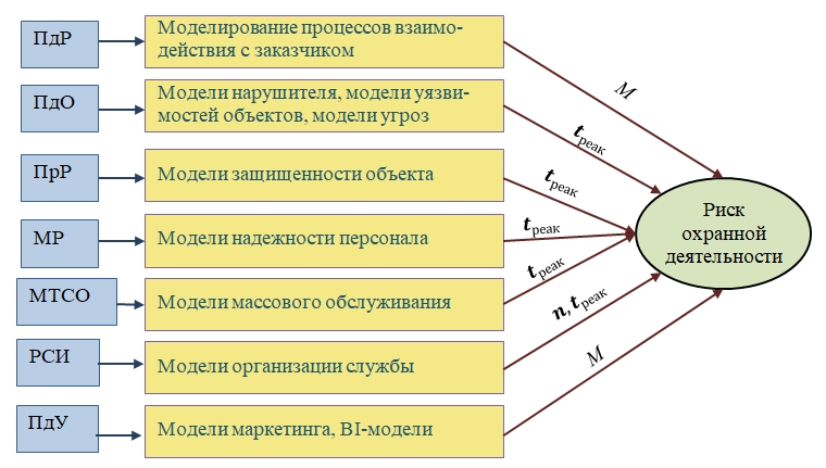 Осуществление охранной деятельности включает в себя и другие вопросы, связанные с техническим, кадровым, экономическим обеспечениями. При этом общим критерием эффективности охранной деятельности может выступать риск охранной деятельности R [15, с. 185]. Это позволяет предложить единый метод моделирования процессов охранной деятельности на основе снижения риска охранной деятельности (см. рис. 2), поскольку целевая функция Ф, как было показано выше, зависит от R, который определяется разными составляющими: M (множество охраняемых объектов), n (количество охранников, ГЗ), (время реакции на попытку нанесения ущерба).