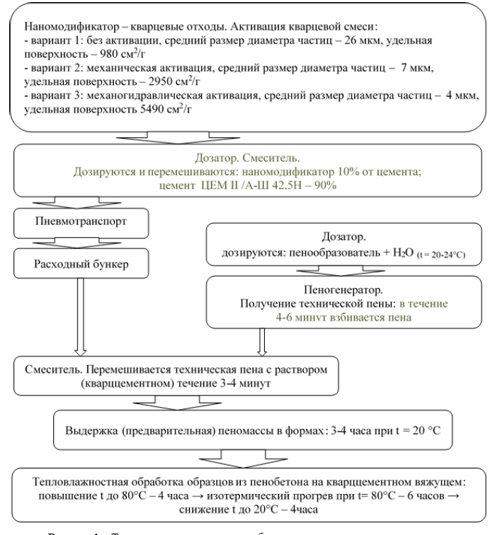 Технологическая схема пенобетона на кварцецементном вяжущем представлена на рисунке 1.