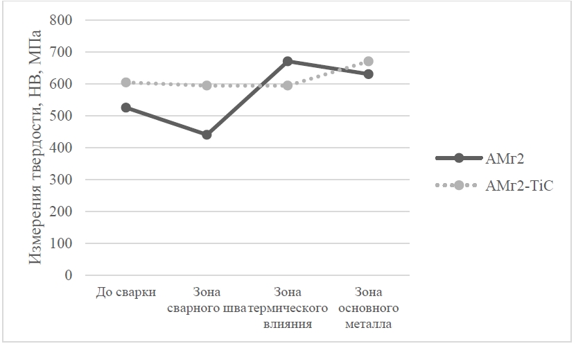 Methods and objects of research: The object of study is the AMg2-TiC composite alloy obtained by the method of self-propagating high-temperature synthesis. Microstructural analysis was carried out on a Jeol JSM 6390A scanning electron microscope. The elemental composition was determined by X-ray microanalysis on a Jeol JSM 6390A scanning electron microscope with a Jeol JED-2200 attachment. The hardness of the samples was determined on a hardness tester ZIP TK=2M using the Brinell method according to GOST 9012-59. Weldability tests were carried out by argon-arc welding using an Everlast Power TIG 210 EXT welding inventory and filler materials that most closely match the chemical composition of the matrix alloy.