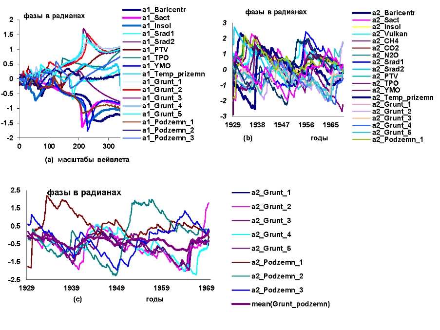Рисунок 1 – Графики изменений: a) и b) вейвлетных фазо-частотных и фазо-временных характеристик гелиокосмических (Baricentr, Sact, Insol, Vulkan, , климатических (Srad1, Srad2, PTV, TPO, YMO, Temp.prizemn) переменных и составляющих водного баланса грунтовых (Grunt1,…,Grunt5) и подземных вод (Podzemn1,…,Podzemn3): c) вейвлетных фазо-временных характеристик грунтовых и подземных вод и усредненной характеристики уровней грунтовых и подземных вод (mean(grunt_podzemn)) в интервале наблюдений 1929,3–1969,6 гг.