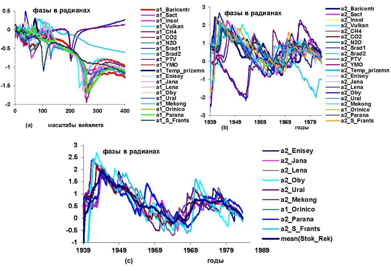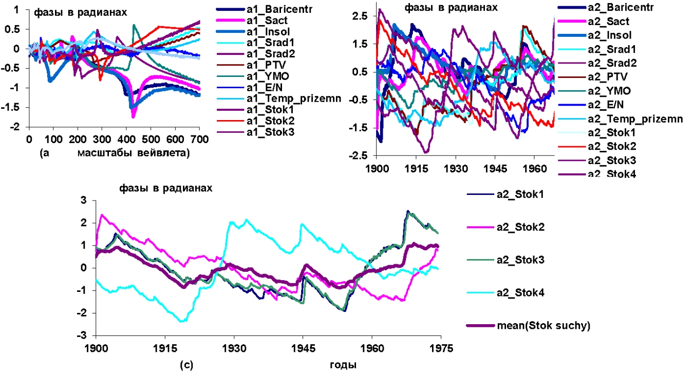 Рисунок 3 – Графики изменений вейвлетных: a) и b) фазо-частотных и фазо-временных характеристик группы переменных: f1, f2, Insol, Vulkan, CH4, CO2, N2O, S.rad1, S.rad2, PTV, YMO, El – Nino (E/N), f3; с) фазо-временных характеристик изменений стоков рек на суше: Stok1, Stok2, Stok3, Stok4 и усредненных значений этих переменных mean(stok sushy) в интервале наблюдений 1900–1974,3 гг.