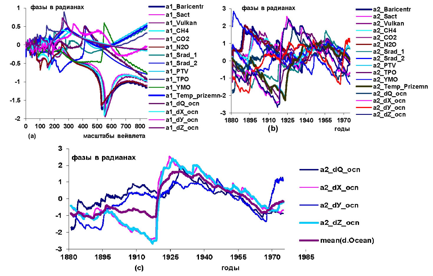 Рисунок 4 – Графики изменений вейвлетных: a) и b) фазо-частотных и фазо-временных характеристик гелиокосмических (Baricentr, Sact, Vulkan, CH4, CO2, N2O), климатических (Srad1, Srad2, PTV, TPO, YMO, Temp.prizemn), составляющих Мирового водного баланса океана в аномалиях (dQ_ocn, dX_ocn, dY_ocn, dZ_ocn); c) вейвлетных фазо-временных характеристик составляющих водного баланса Мирового океана в аномалиях dQ, dX, dY, dZ и их усредненной кривой mean(d.okean) в интервале наблюдений 1881,1–1975 годы