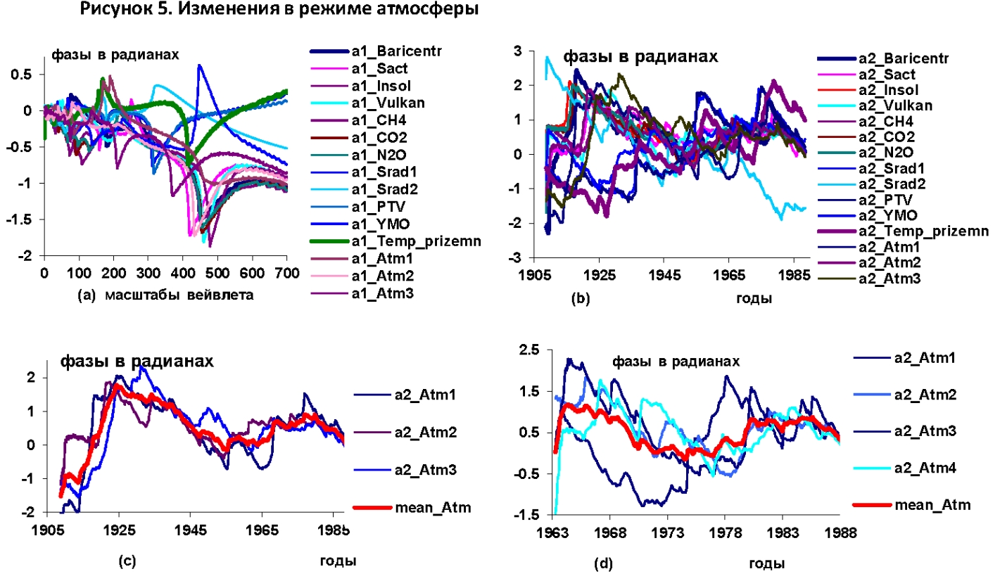 Рисунок 5 – Графики изменений в режиме атмосферы: а) и b) вейвлетных фазо-частотных и фазо-временных характеристик гелиокосмических, климатических переменных и составля-ющих режимов атмосферных процессов (Atm1,…,Atm4) в интервале времени 1908,5–1988,5 годы; c) и d) фазо-временные характеристики изменений режимов атмосферных процессов и их усредненные кривые в интервалах времени 1908,5–1988,5 и 1963,3–1988,5 годы