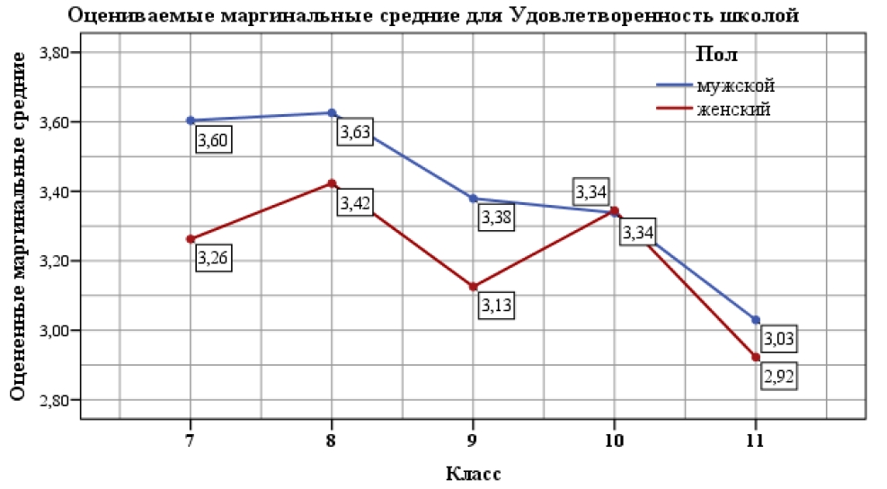Среди всех факторов благополучия «Удовлетворенность школой» получило наиболее низкие оценки. Снижение более чем на полбалла (с 3,53 в 8 классе до 2,96 в 11 классе) достаточно существенно с учетом 5-балльной шкалы. Особенно тревожит факт, что именно выпускники отмечают низкую удовлетворенность.