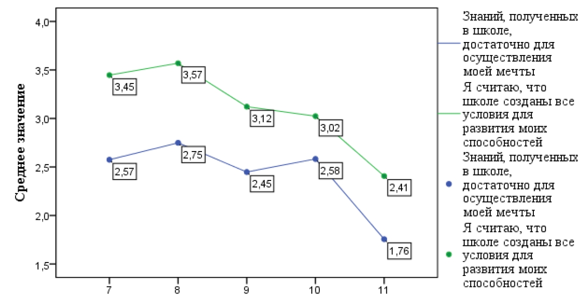 Результаты по данным вопросам показывают отчетливое рассогласование между образовательными потребностями обучающихся и школьными образовательными результатами. Максимум этого рассогласования достигается именно на этапе окончания школы, когда выпускники оценивают ниже 2 баллов факт того, что «знаний, полученных в школе, достаточно для осуществления своей мечты». Это оценка ситуации сопряженности будущего и настоящего, и того, насколько настоящее обеспечивает благополучие будущего. Несоответствие между ними может быть частью стресса, который переживают выпускники на данном этапе.