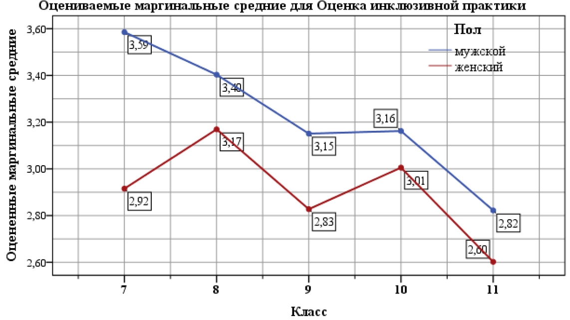 Если практику рассматривать как проявление политики, то средние показатели по инклюзивной политике проявляются и в такой же оценке инклюзивной практики. Например, «В нашей школе учителя и ученики относятся друг к другу с уважением» – 3,4 балла. Безусловно негативно рассматривается факт, что учащиеся 11-ых классов в среднем на 1 балл ниже оценивают инклюзивную практику в школе. С одной стороны, можно предположить, что выпускники более зрело, а, значит, объективно оценивают ситуацию в школе. Но. с другой, учащиеся 11-ых классов все факторы оценивают более низко, чем учащиеся других параллелей.