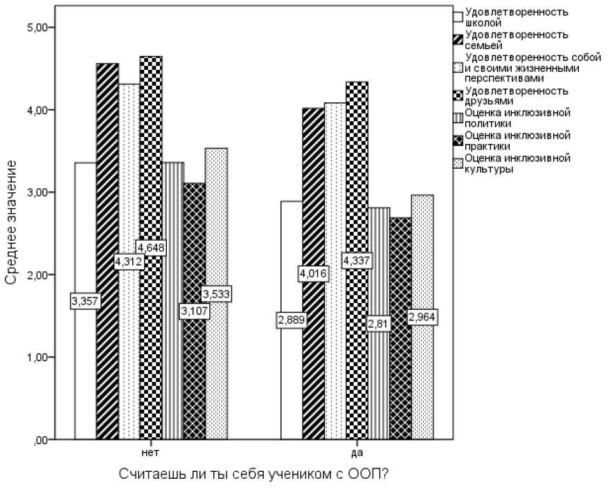 Опросник для оценки особенностей субъективного благополучия включал 55 вопросов, а для оценки инклюзивной среды школы – 42 вопроса.
