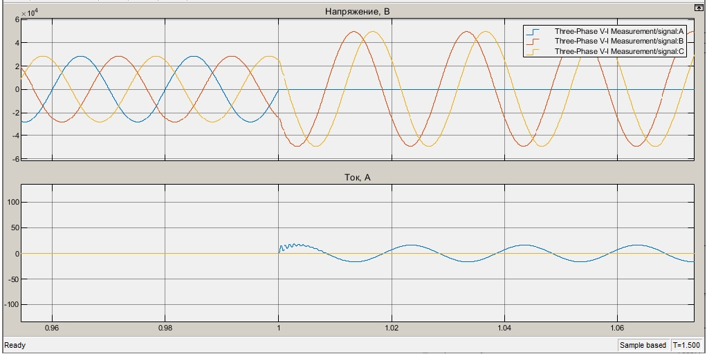 Для моделирования режима ОЗЗ выставляется время моделировании 1,5 секунды, поскольку в блоке Three – Phase Fault указан промежуток времени замыкания от 1 до 2 секунд. Если необходимо смоделировать режим работы сети на более длительном промежутке времени, то нужно увеличивать промежуток времени замыкания и увеличивать время моделирования.