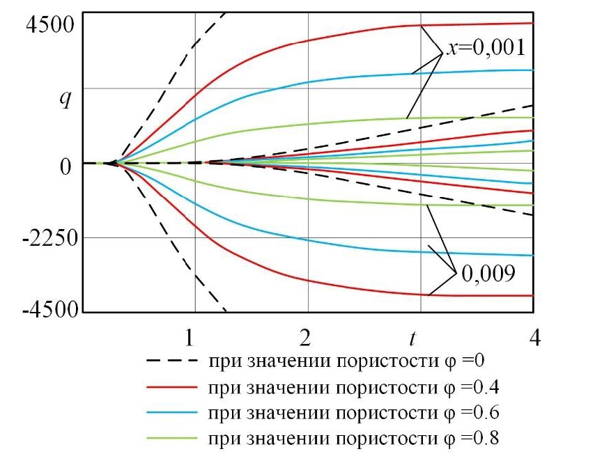 На рис. 4 представлена зависимость распределения плотности теплового потока в пористой пластине во времени от значений пористости . Пунктирной линией представлена плотность теплового потока для сплошного тела, то есть при пористости . Из анализа данного рисунка следует, что при варьировании коэффициента пористости возможно регулирование значения плотности теплового потока. Следовательно, на основании полученных зависимостей возможно создание пористого материала с заданными теплофизическими свойствами. Полученные результаты могут иметь практическое значение в изучении теплоизоляционных материалов, что связано с возможностью изменения толщины материала и регулирования проходящего теплового потока.
