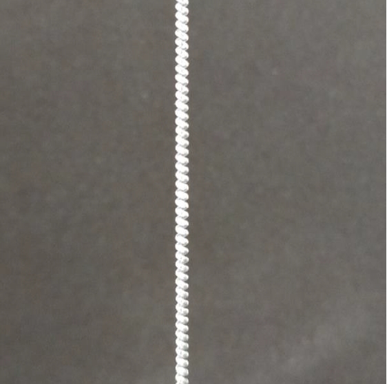 Следующим этапом были проведены аналогичные эксперименты с нейлоновой леской диаметром 0.5 миллиметра. Так же, как и в варианте со спиралью из нейлоновой лески диаметром 1.2 миллиметра, изготавливаем спираль из нейлоновой лески диаметром 0.5 миллиметра. Так как диаметр используемой лески стал значительно меньше, чем в прошлом эксперименте, то и вес, подвешиваемый на один из концов лески, используемый в качестве натяжителя для закрутки, необходимо использовать меньше, а именно – 260 грамм. Данный вес груза был подобран, как и в прошлом эксперименте, опытным путем. Выбор более маленького веса позволит избежать случаев разрыва лески при образовании вторичной закрутки. Исходная длина нейлоновой лески также составляла 1 метр, но после проведения вторичной спирализации спираль стала длиной 45 сантиметров. Увеличение длины конечной спирали в напряженном состоянии произошло вследствие того, что диаметр поперечного сечения лески значительно меньше предыдущего экспериментального образца и диаметр витков спирали также меньше, чем диаметр витков предыдущей спирали.