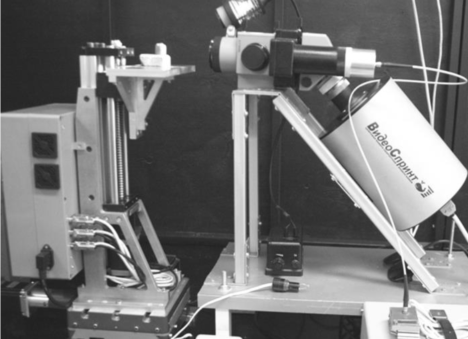 Чувствительность метода экспресс-диагностики СВС-материалов, основанного на измерении макрокинетики реакции, существенно зависит от погрешности средств контроля скорости распространения фронта горения и температуры синтеза. Для экспериментального исследования использовался оригинальный микротепловизионный комплекс, включающий микроскоп МБС-10, полосовой светофильтр SL-725-40 ( нм), скоростную камеру ВидеоСпринт и спектрометр LR1-T (рис. 1) [8, 9]. КМОП-сенсор камеры имел размерность 1280х1024 фотоэлемента. Полосовой светофильтр в оптическом тракте камеры превратил каждый фотоэлемент размером 12х12 мкм в отдельный канал яркостной пирометрии, а совмещение области зрения камеры и спектрометра на базе стереомикроскопа, позволило применить метод спектрально-яркостной пирометрии (СЯП) и добиться погрешности измерения температуры реакции высокотемпературного синтеза на уровне 0.5 % [10–12].