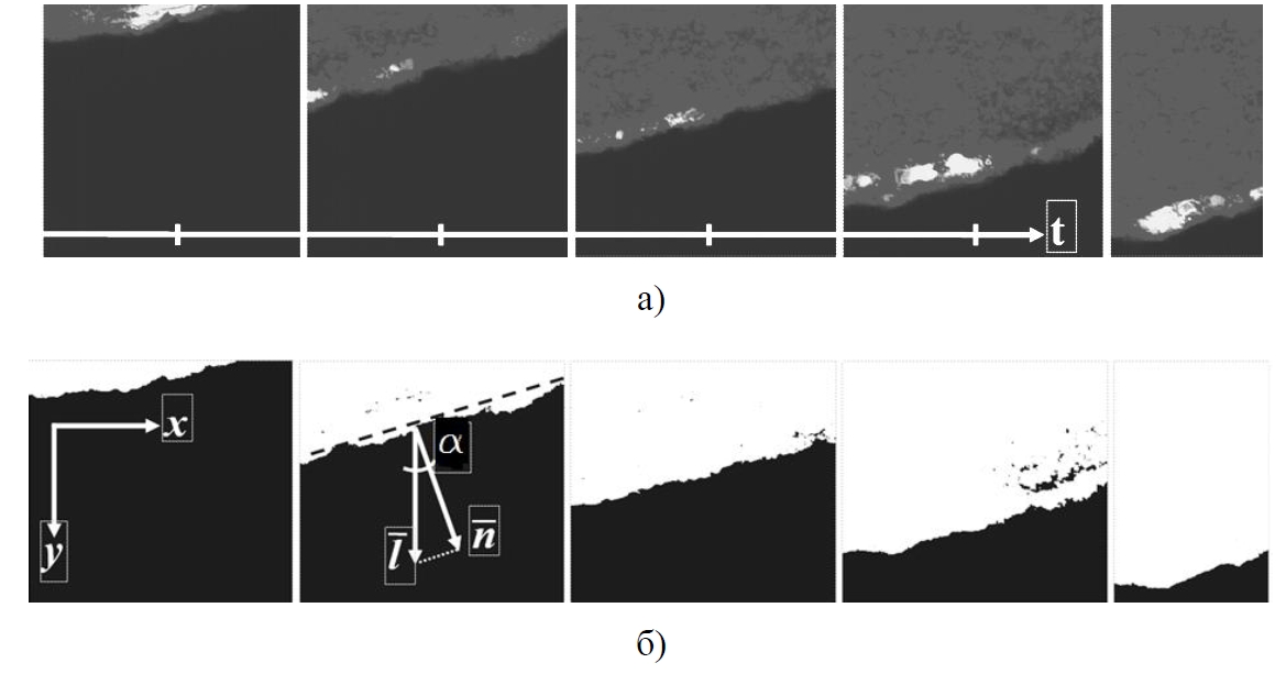 Координата по оси Y отражает положение центра фотоэлементов в столбце датчика, а координата по оси X – в его строке. Обозначим единичным вектором направление наблюдения за положением фронта, а единичным вектором направление перемещения фронта. Будем считать, что направления оси Y и вектора совпадают. Произведем бинаризацию данных микротепловизионной съемки так, чтобы любой элемент изображения менял свое состояние во времени с "черного" на "белый" только один раз, когда температура соответствующей области объекта в первый раз превысит температурный порог (рис. 3).