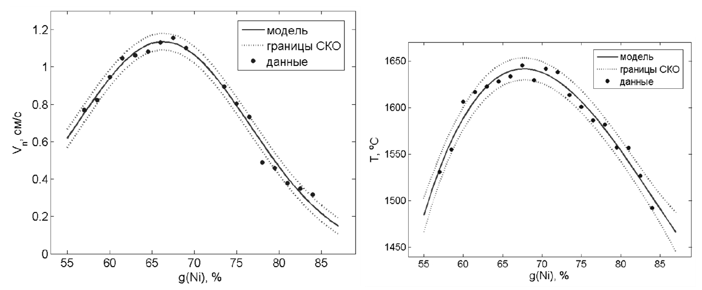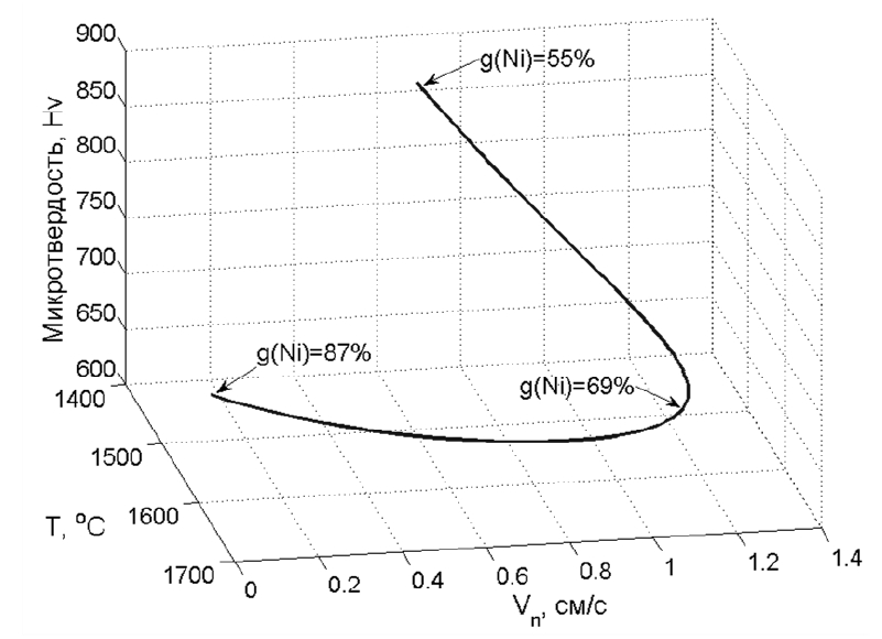Зависимость «макрокинетический параметр СВС – свойство конечного продукта» строилась на базе экспериментальных исследований в системе Ni – Al. При подготовке шихты использовались: Ni – марка ПНК-УТ3 дисперсностью 5-10 мкм; Al – марка ПА-4 дисперсностью 25-30 мкм. В бинарной системе Ni-Al варьировалась массовая доля никеля от 57 до 87 % с шагом 1.5. Кажущаяся плотность образцов шихты была фиксирована на уровне 2.6 г/см3, а начальная температура составляла 25оC. Подготовка образца выполнялась в кварцевой трубке с внутренним диаметром 20 мм. Его уплотнение осуществлялось посредством вибрации и весового давления металлического цилиндра диаметром 19.6 мм массой 50 грамм. Масса экспериментальных образцов составляла 18 грамма, а их высота 22 мм. Готовый образец шихты в кварцевой трубке размещался в перед объективом микротепловизионного комплекса, которым осуществлялась регистрация процесса СВС с пространственным и временным разрешением 5.8 мкм и 2 мс соответственно. В результате обработки микротепловизионной съемки всех образцов получены зависимости скорости фронта и температуры волны СВС от массовой доли никеля (рис. 5).