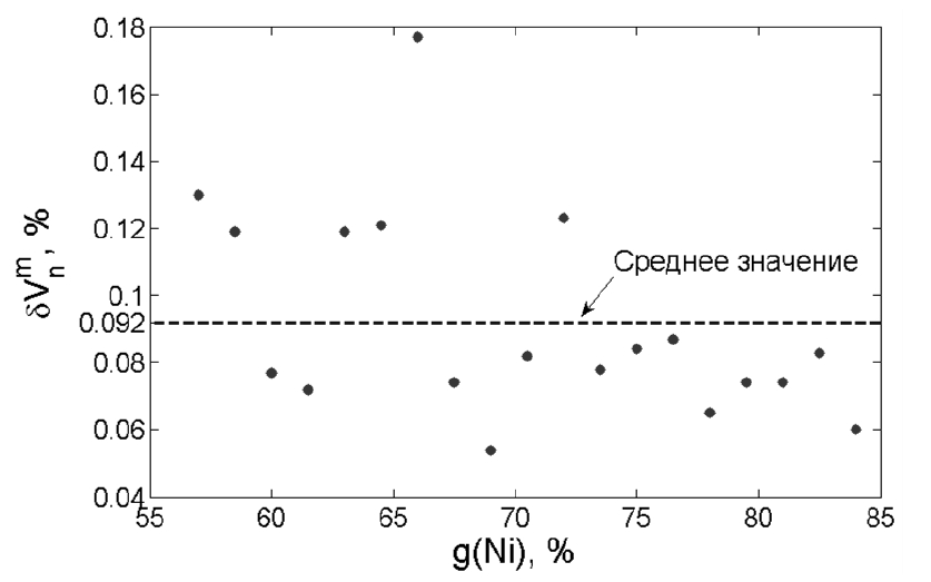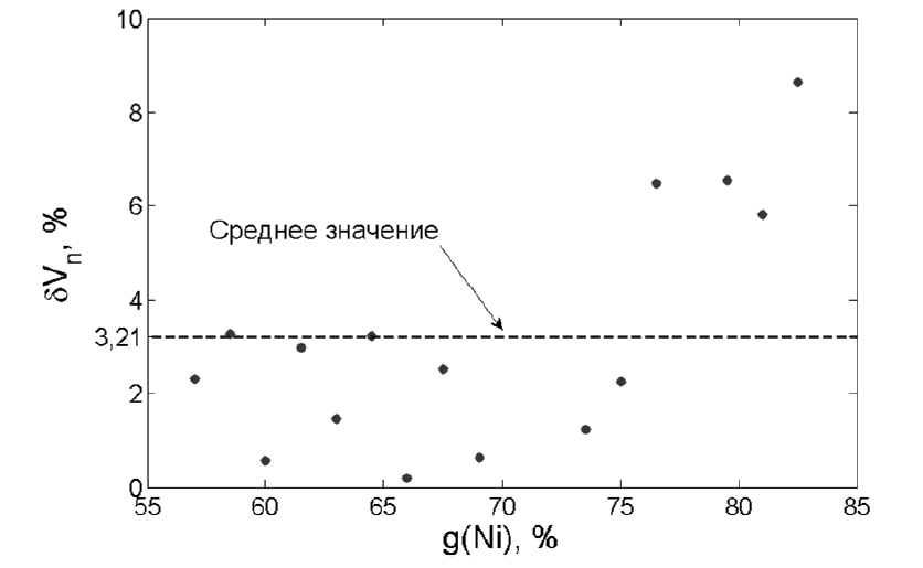 На завершающей стадии экспериментальных исследований был выполнен микродюрометрический анализ образцов, и получена зависимость средней микротвердости материала-продукта, определенная по 30 уколам индентора в произвольные области каждого образца, от массовой доли никеля (рис. 8).
