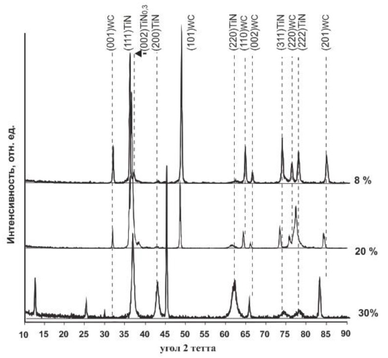 Изменение содержания N2 в вакуумной камере приводит к изменению фазового состава покрытия TiN и его структурных характеристик (рис. 1, табл. 1). При минимальном содержания N2 формируется двухфазное покрытие с преобладанием объемной доли кубической фазы с-TiN, дополнительной фазой является гексагональная фаза h-TiN0,3. Увеличение содержания N2 до 30 % приводит к исчезновению гексагональной фазы h-TiN0,3 и формированию однофазного покрытия на основе фазы с-TiN.