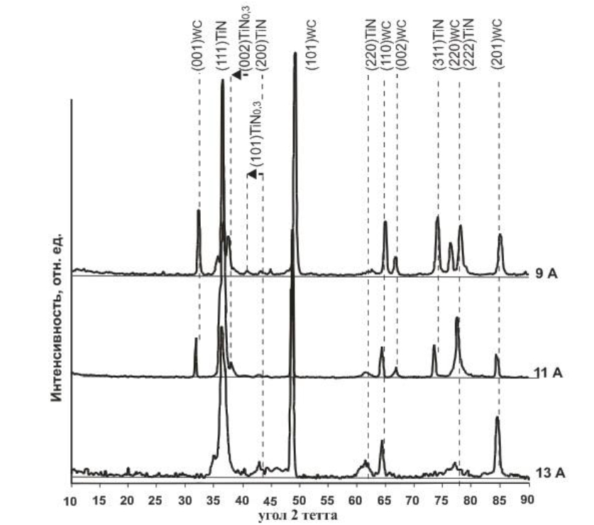 Величина разрядного тока, подаваемого на титановую мишень магнетрона в диапазоне ITi = 9…13 А оказывает влияние на соотношение входящих основных фаз покрытия: с-TiN и h-TiN0,3 (рис. 2). Двухфазное покрытие на основе фазы (111) с-TiN формируется при значении разрядного тока 9…11 А (табл. 2). Увеличение разрядного тока до 13 А приводит к исчезновению дополнительной фазы h-TiN0,3. Формируется однофазное покрытие на основе фазы (111) с-TiN с максимальной степенью текстурированности зерен. По уменьшению отклонения параметра КР Dа основной фазы с-TiN, уменьшению уширения пиков основных фаз β0 и отклонению положений дифракционных пиков D2q можно судить о снижении степени деформации КР и уменьшению уровня внутренних напряжений в покрытии, формируемом при увеличении величины разрядного тока до 13А.