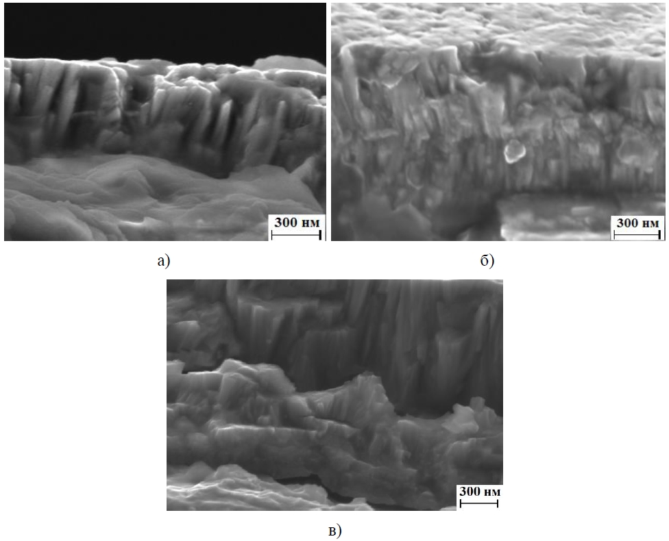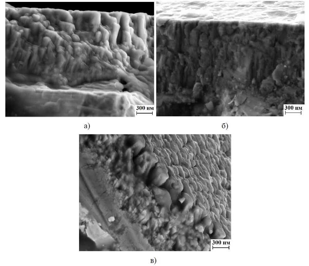 Рисунок 4 – Микроструктура покрытий TiN, сформированных при величине разрядного тока: а) 9 А; б) 11 А; в) 13 А