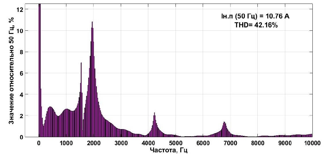 Результат быстрого преобразования Фурье осциллограммы тока однофазного замыкания на землю (рис. 4) позволяет зафиксировать действующее значение тока основной составляющей (50 Гц) на уровне 10,76 А и наличие существенных гармонических искажений (коэффициент суммарного гармонического искажения THD более 42 %). При этом фиксируется эффект растекания спектра.