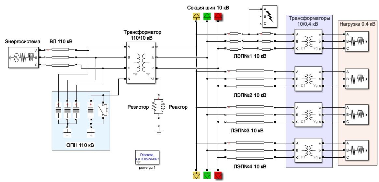 Имитационное моделирование ОЗЗ в сети 10 кВ произведем в среде моделирования Matlab Simulink. От главной понизительной подстанции 110/10 кВ отходят 4 линии 10 кВ, на одной из которых будем имитировать ОЗЗ (рис. 2).