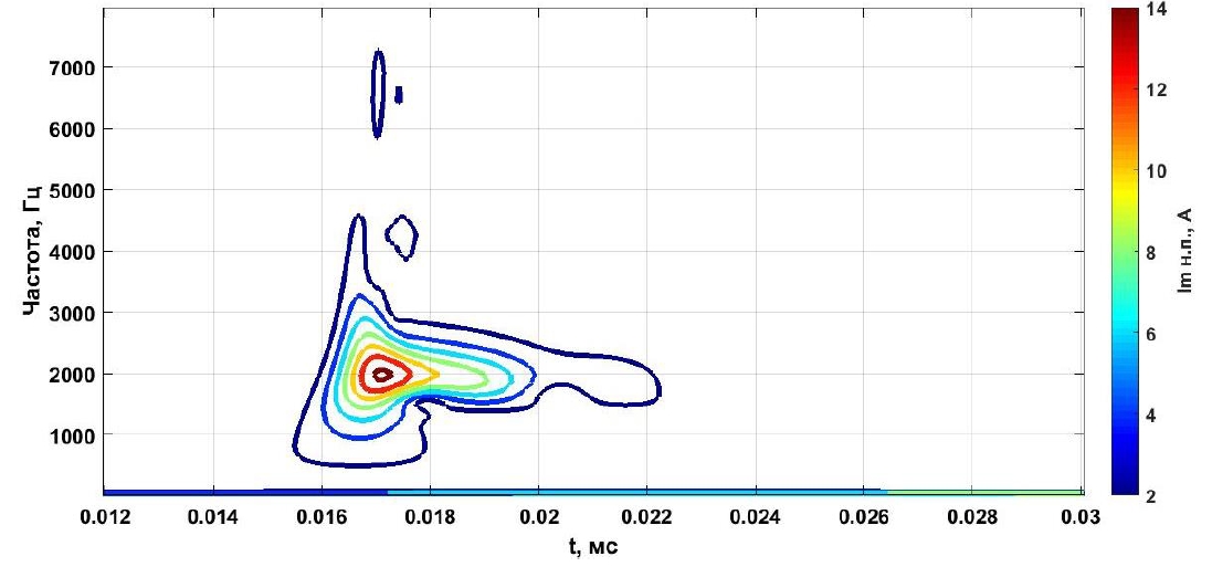 Возможности применения непрерывного вейвлет-преобразования для локализации замыканий в распределительных сетях представлены в работе [8], где авторы отмечают важность выбора функции материнского вейвлета. Проведем непрерывное вейвлет-преобразование осциллограммы тока замыкания не землю (рис. 5). В результате преобразования, фиксируется время, амплитуда, длительность присутствия и частота высших гармоник, возникающих при переходном процессе ОЗЗ.