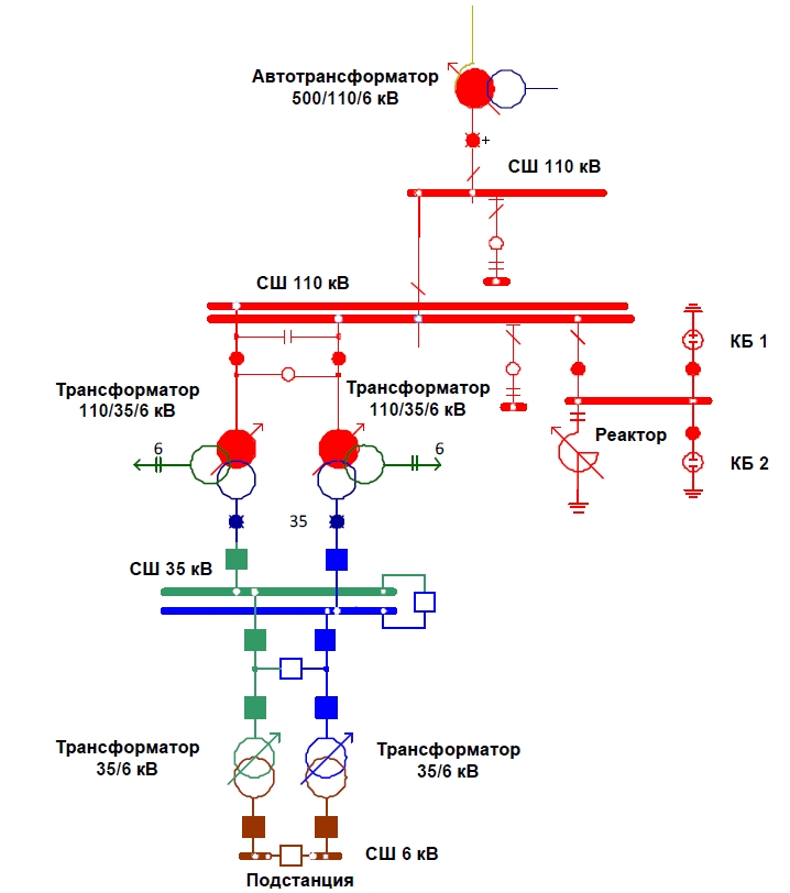 Произведем расчет резонансных режимов в электрической сети 110/35/6 кВ, питающей объекты нефтедобычи в Ханты-Мансийском автономном округе – Югре. Схема исследуемой сети представлена на рисунке 1.