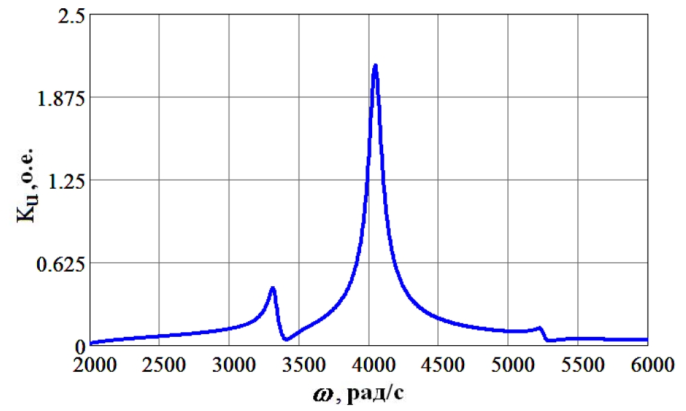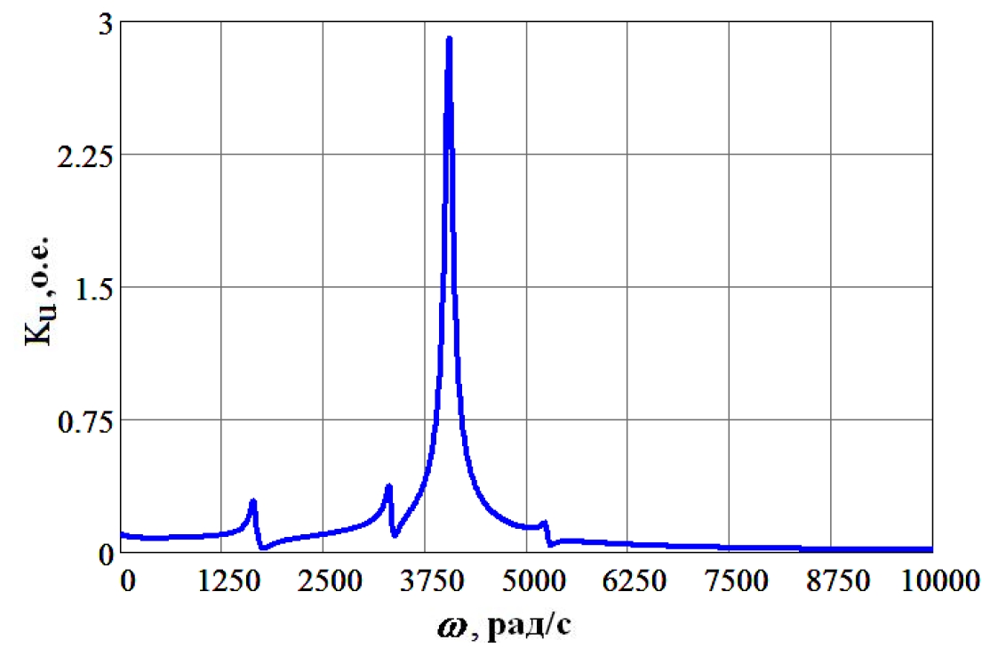 Графические зависимости кратности перенапряжения от частоты для различных классов напряжения представлены на рисунках 4–7. Максимальные кратности перенапряжения (KU), частоты, на которых возможен режим резонанса (f) и порядок ВГ, на частотах которых возможен резонанс (n) при различных классах напряжения (U) (в различных точках рассматриваемой сети), представлены в таблице 2.
