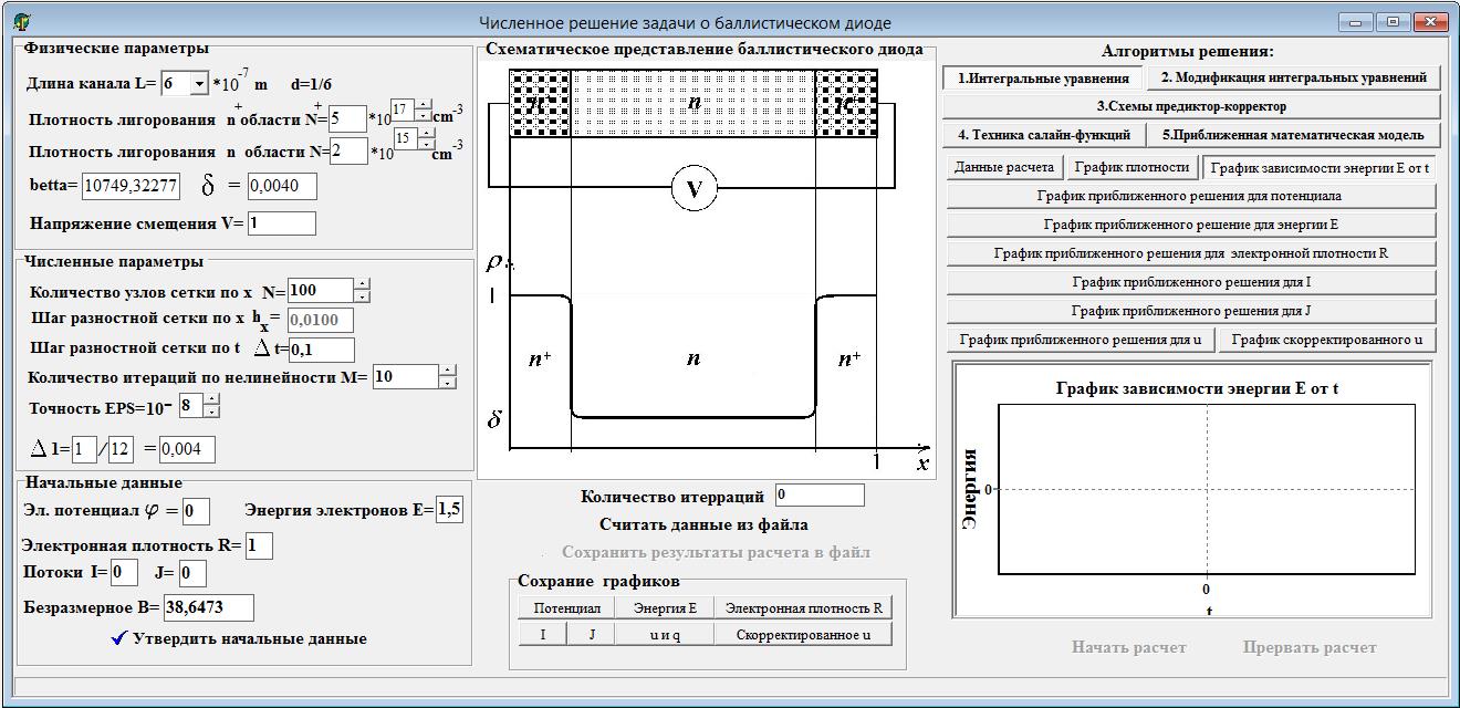 В окне «Численное решение задачи о баллистическом диоде» (рисунок 3) необходимо задать физические и численные параметры, утвердить начальные данные или считать данные из файла, указать количество итераций, выбрать алгоритм решения задачи. Только после этого можно будет получить решение задачи и сохранить в файл. Более того, в системе возможно следить за поведением графика зависимости энергии от времени.