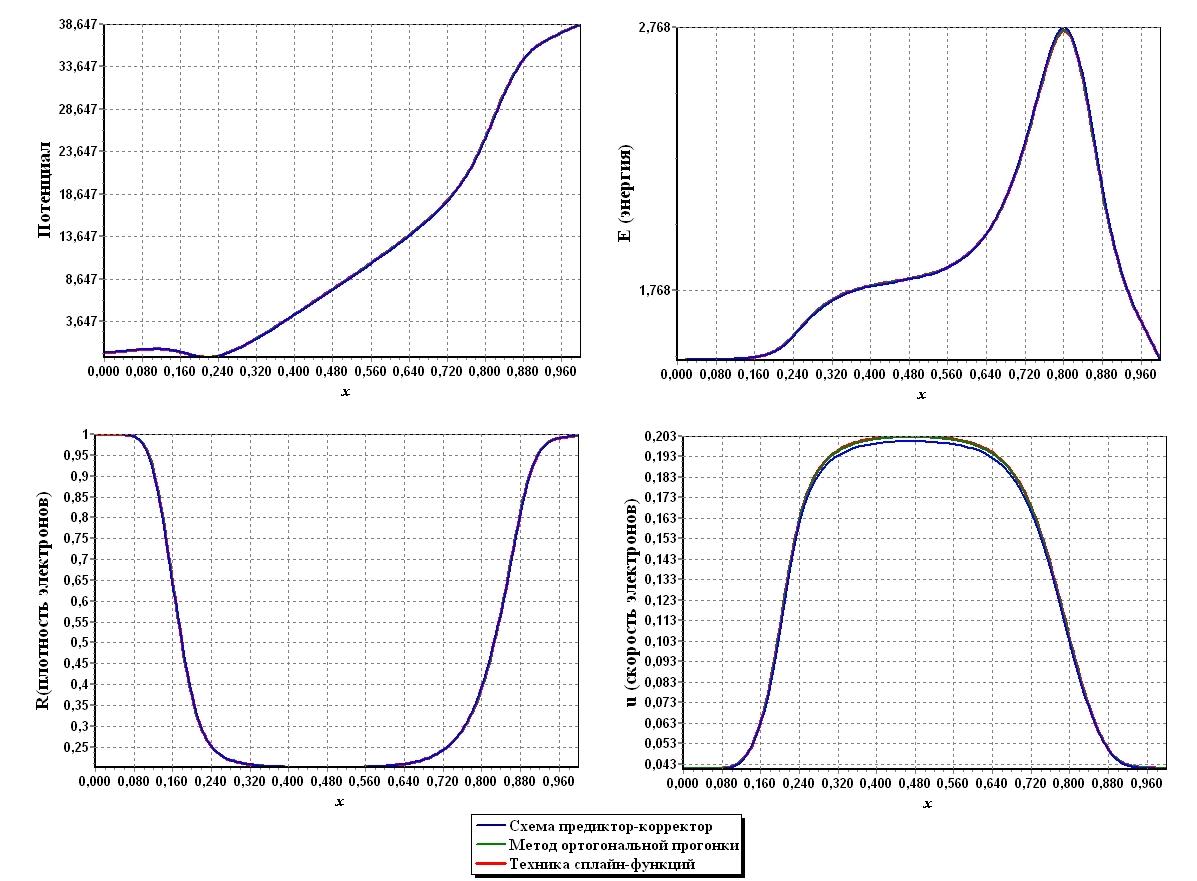 Проверку правильности работы разработанных алгоритмов осуществили с помощью метода ортогональной прогонки. Данный метод позволяет проводить расчеты с заданной точностью. На рисунке 5 представлены результаты метода ортогональной прогонки и разработанных алгоритмов. Из рисунка видно, что результаты практически совпадают, т.е. графики, построенные для плотности, потенциала и энергии электронов разными алгоритмами совпали. Есть небольшие расхождения только для скорости электронов.