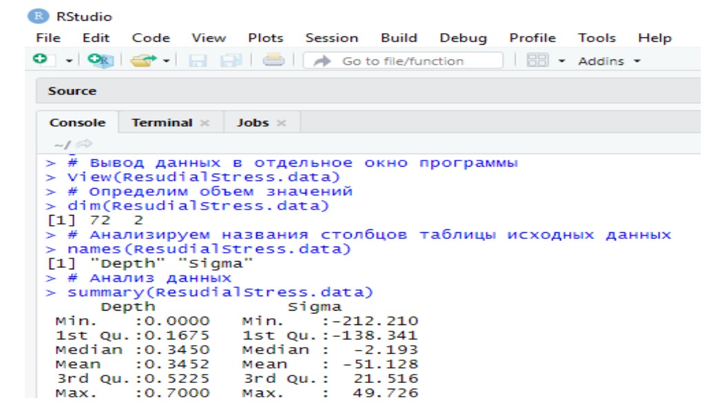 Разработанный нами алгоритм на языке программирования R позволяет производить компьютерный экспресс-анализ числовых массивов информации. В рамках компьютерного анализа программа в автоматическом режиме работает с числовыми значениями количественной информации по всему массиву (рисунок 1), а также строит эпюру остаточных напряжений в разных вариантах визуализации, с функцией кластерного анализа.