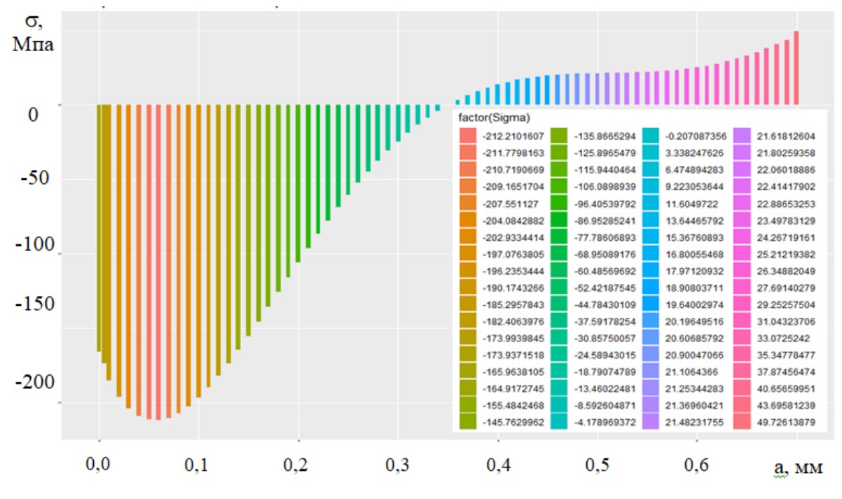 В качестве альтернативного варианта визуализации эпюры остаточных напряжений мы предлагаем вариант гистограммы, изображенной на рисунке 4. В данном случае выбор цвета осуществляется программой автоматически, однако при необходимости мы можем задать необходимые нам цвета, и/или их оттенки.