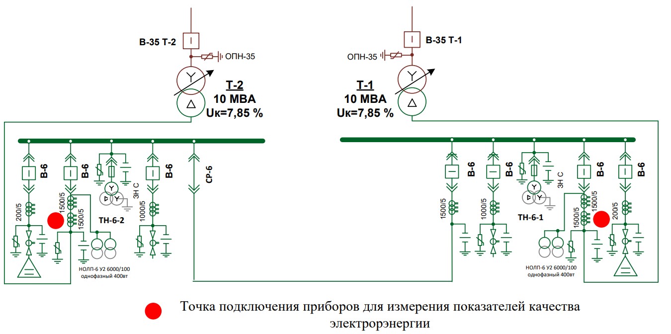 Для проведения активного эксперимента была выбрана подстанция 35/6 кВ, питающая объекты нефтедобычи в Ханты-Мансийском автономном округе – Югре. Схема исследуемой подстанции и точки подключения приборов представлены на рисунке 2.