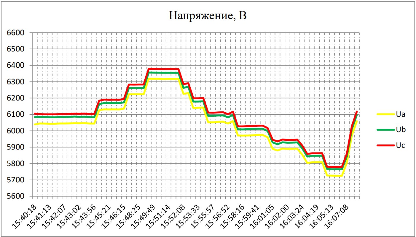 Трансформаторы оснащены устройствами РПН с пределами регулирования напряжения ±8х1,5 %. В рамках проводимого эксперимента напряжение регулировалось ступенчато при помощи устройства РПН в диапазоне от 5756 В до 6350 В. График изменения линейных напряжений представлен на рисунке 3.